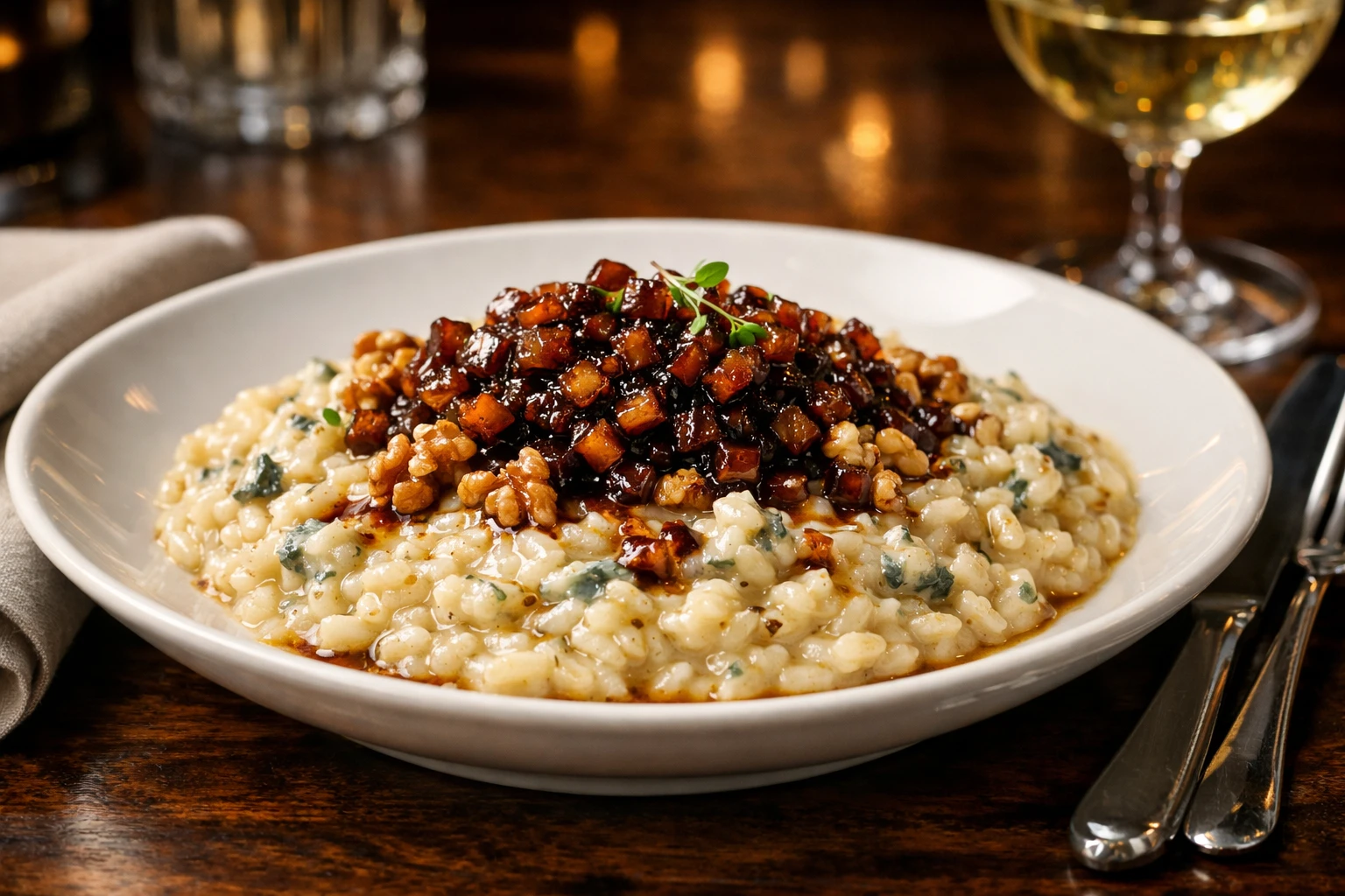 Risoto de Gorgonzola com Cebola Caramelizada e Nozes Tostadas
